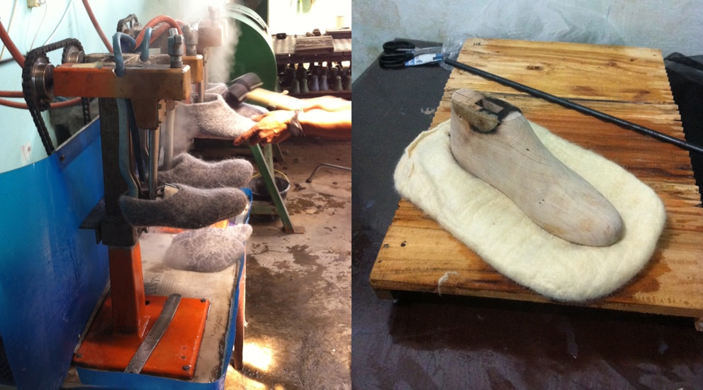 Soon thereafter Dan’s job sent us to Jakarta, Indonesia, and it was there, while being immersed in a foreign culture, that we became excited by the idea of exploring the unfamiliar in another way and decided to make a pair of felted wool shoes in our kitchen. Maybe it was because neither one of us had any experience in shoe manufacturing or working with wool, but calling our first creations shoes was a stretch considering they looked more like a sheep that had wandered through a car wash.