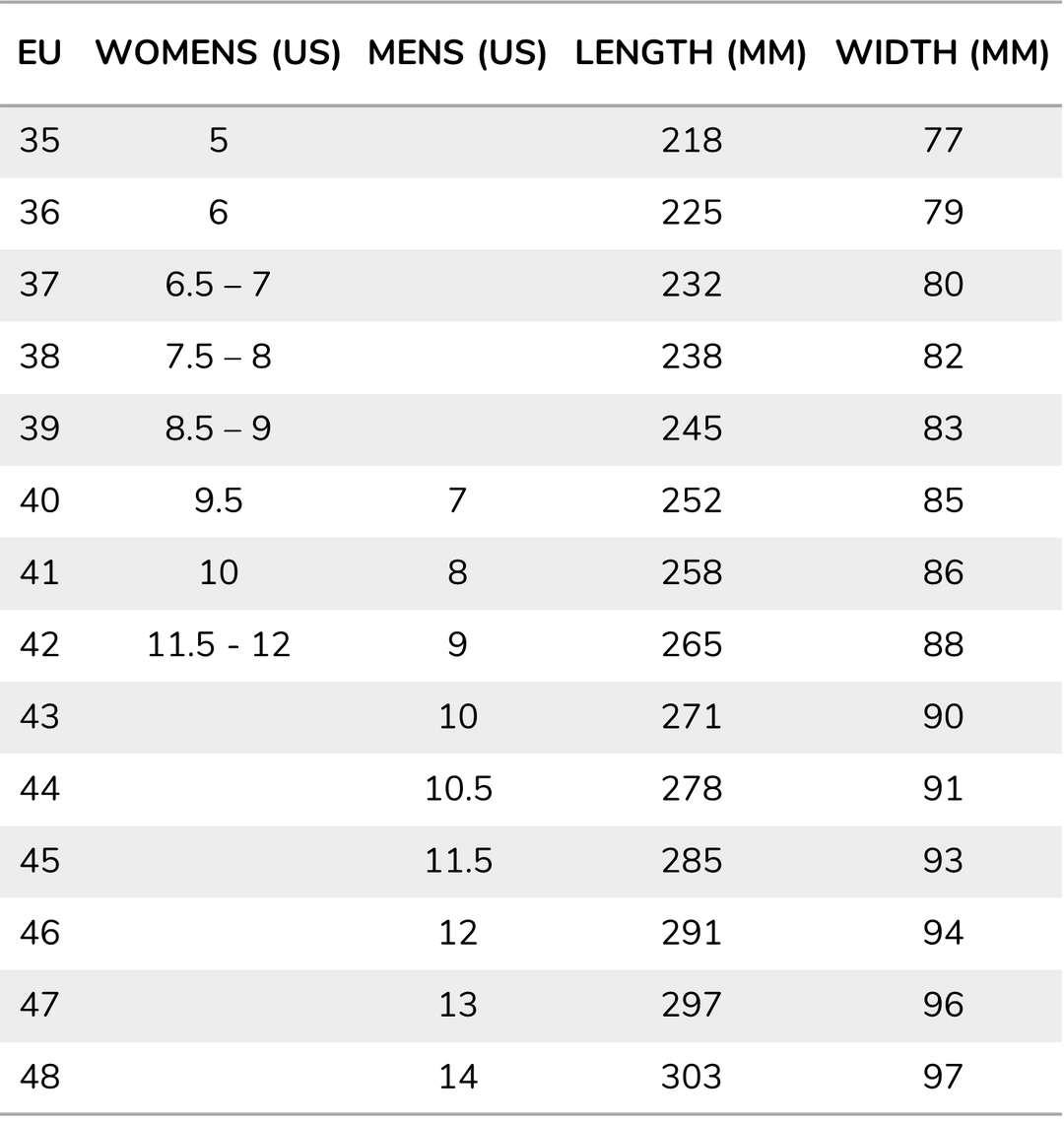 Find your perfect fit by measuring your feet in mm and searching for your size in the chart below.