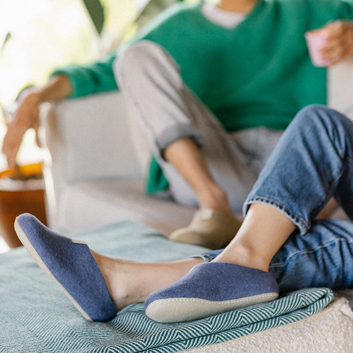We make our felted wool slippers the traditional way: by hand using only 100% New Zealand wool, soap, and water. This gives them that light coziness that makes anywhere you wear them feel like home.