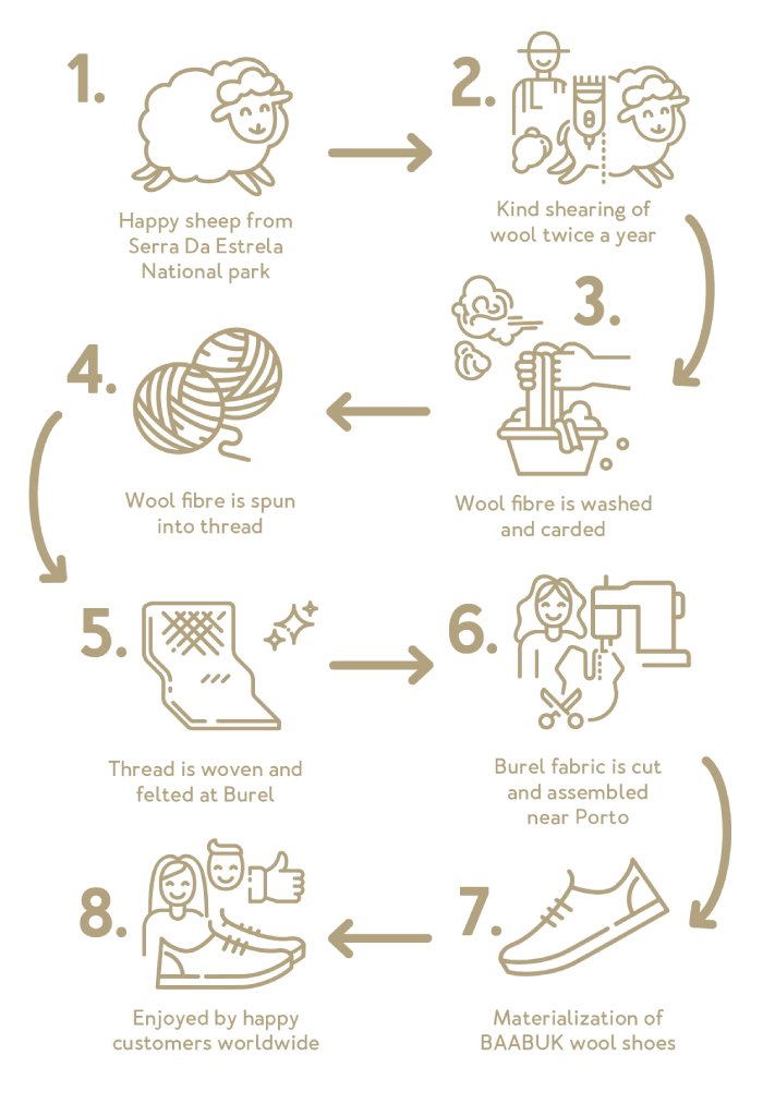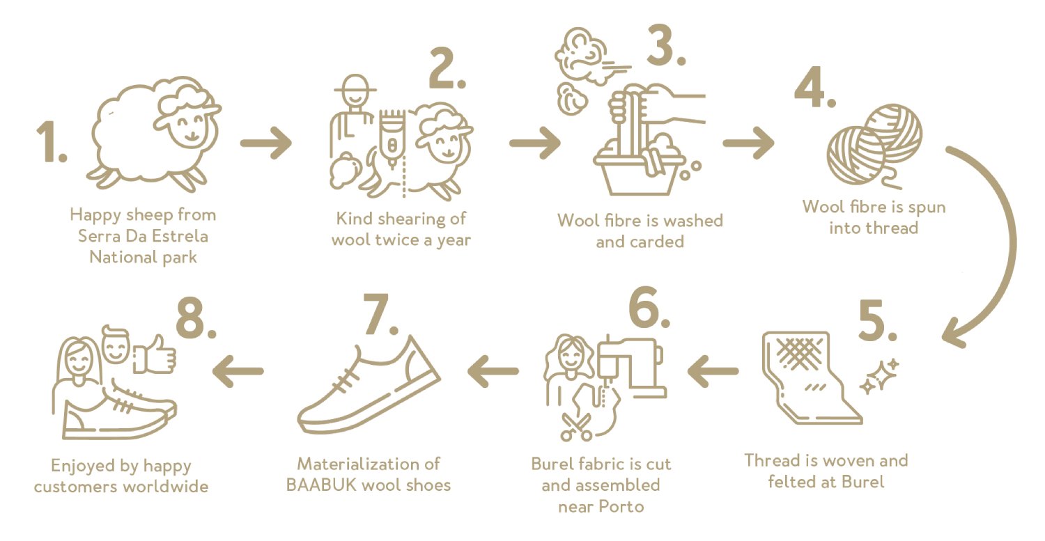 Materials: Natural Portuguese mulesing-free sheep wool upper & inner lining. Durable rubber sole & genuine top-grain Nubuck. Includes an inner sole with wool covering and elastic laces.